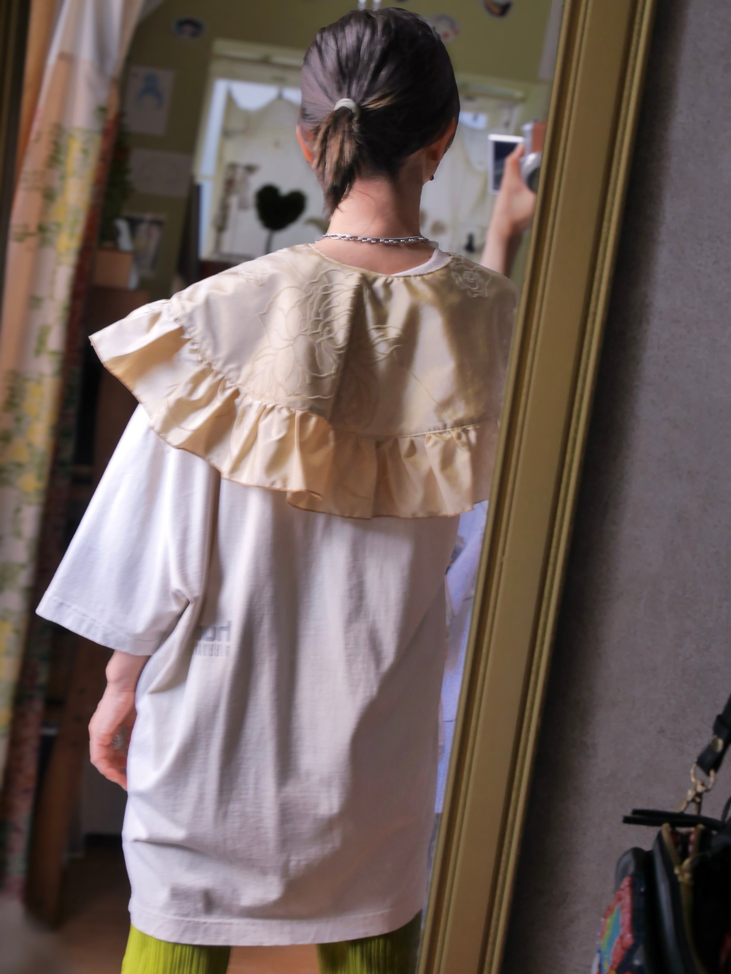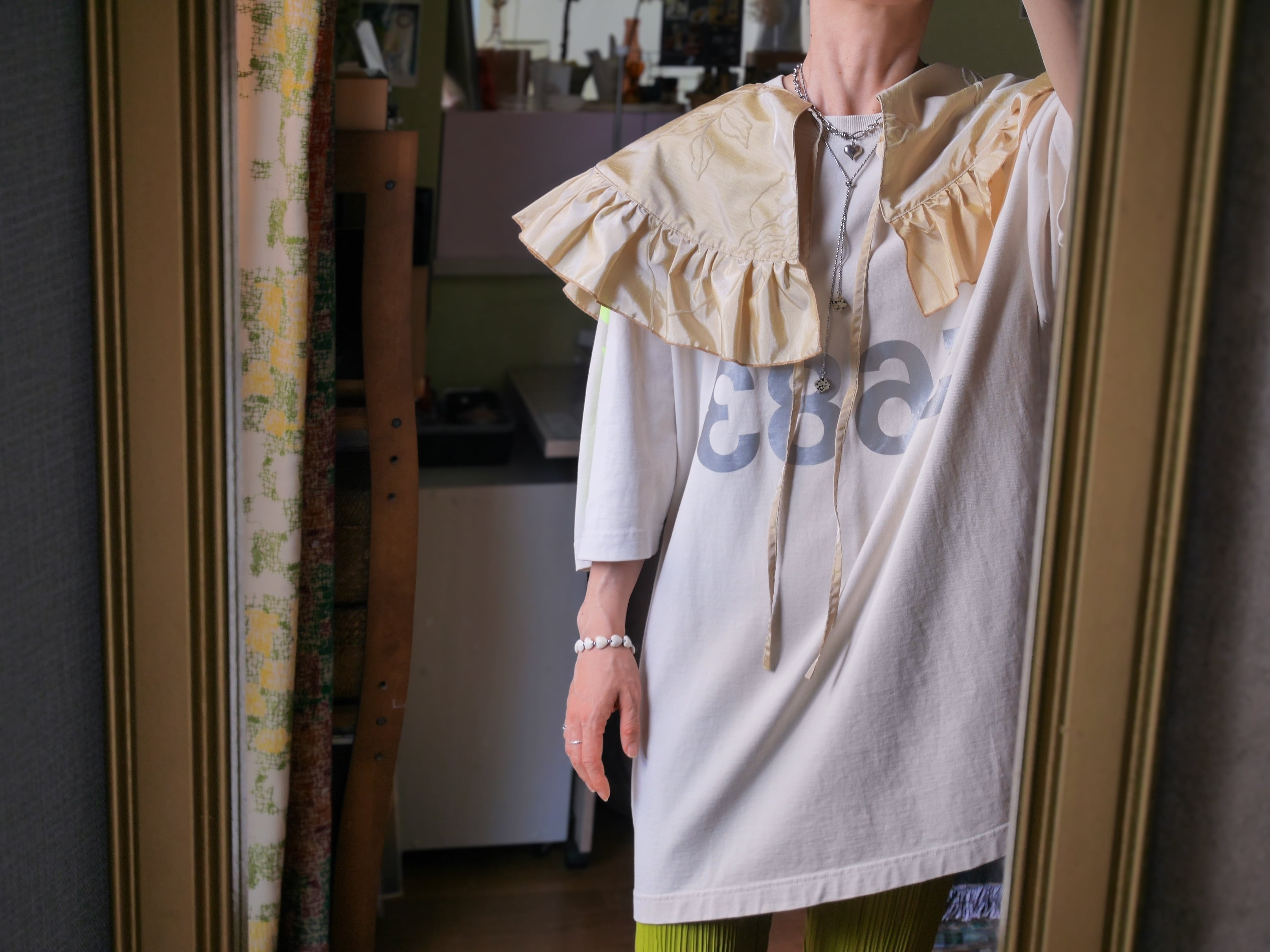 大きな襟部分にはお気に入りのブローチをプラスしたり、リボンを後ろに回して背中のアクセントにしたり、楽しみ方は無限大です