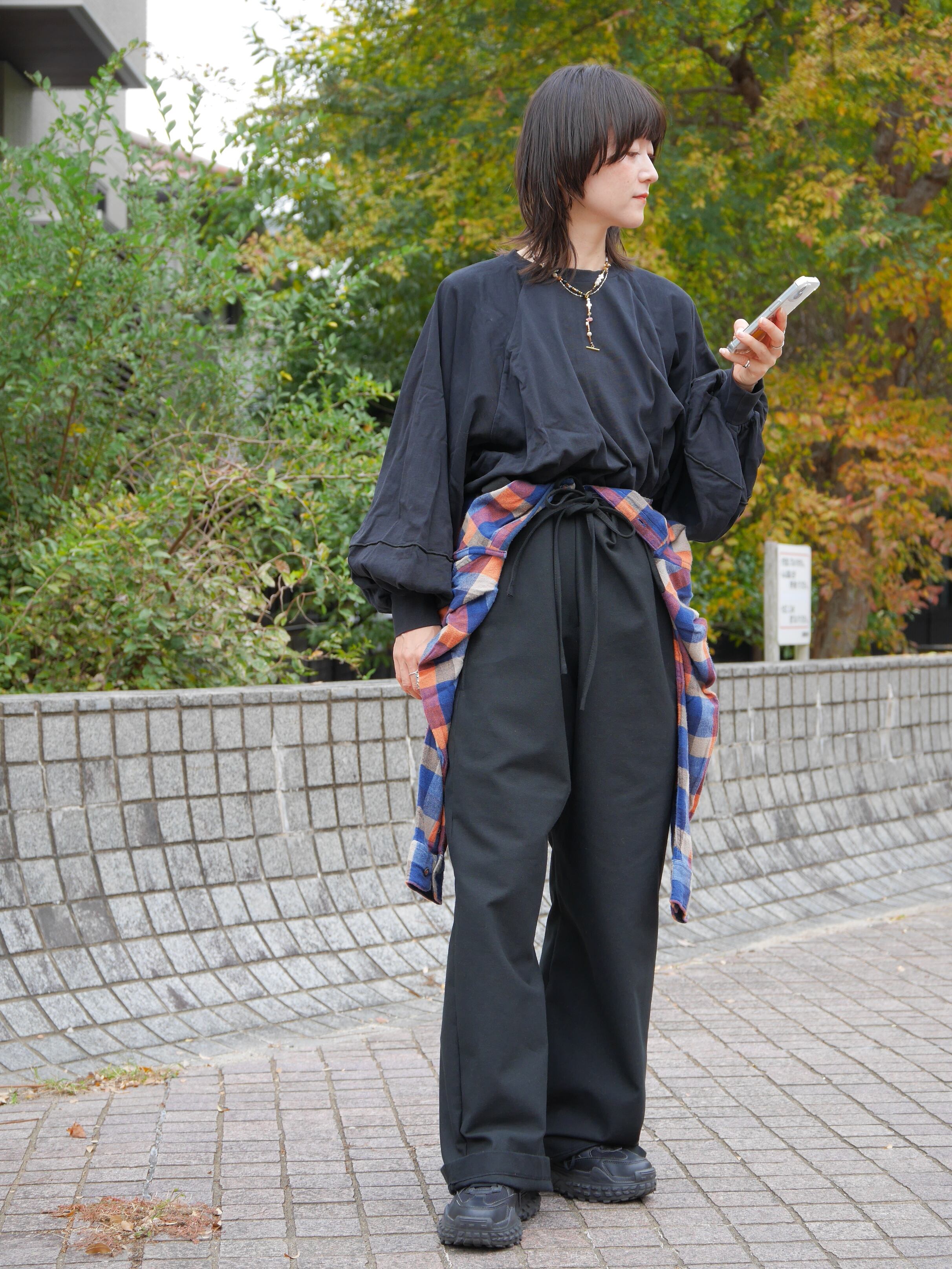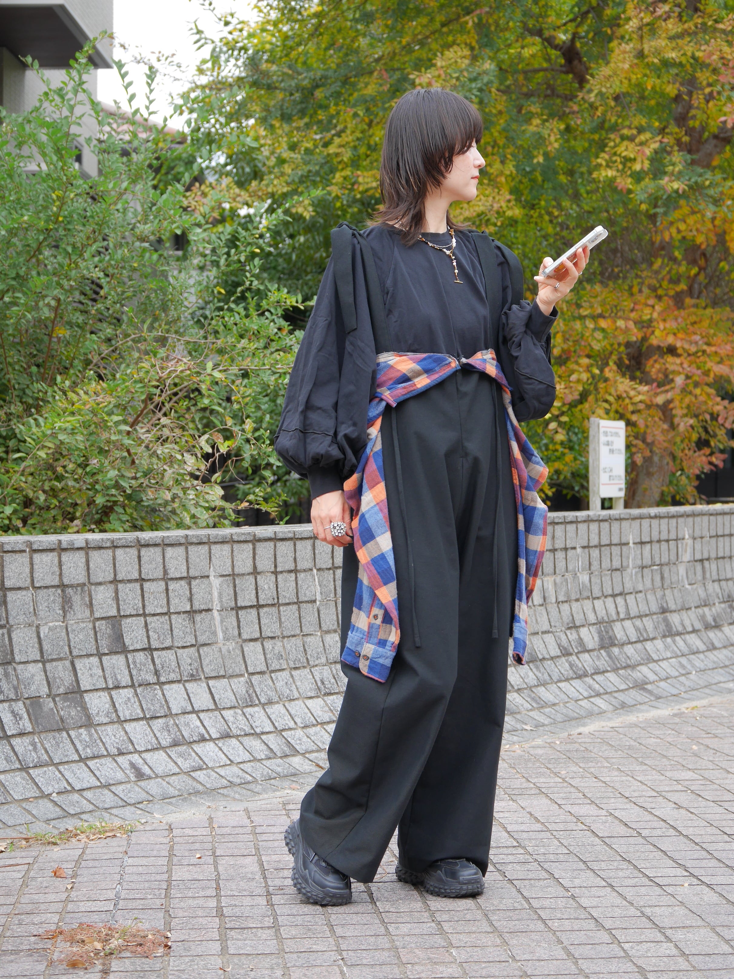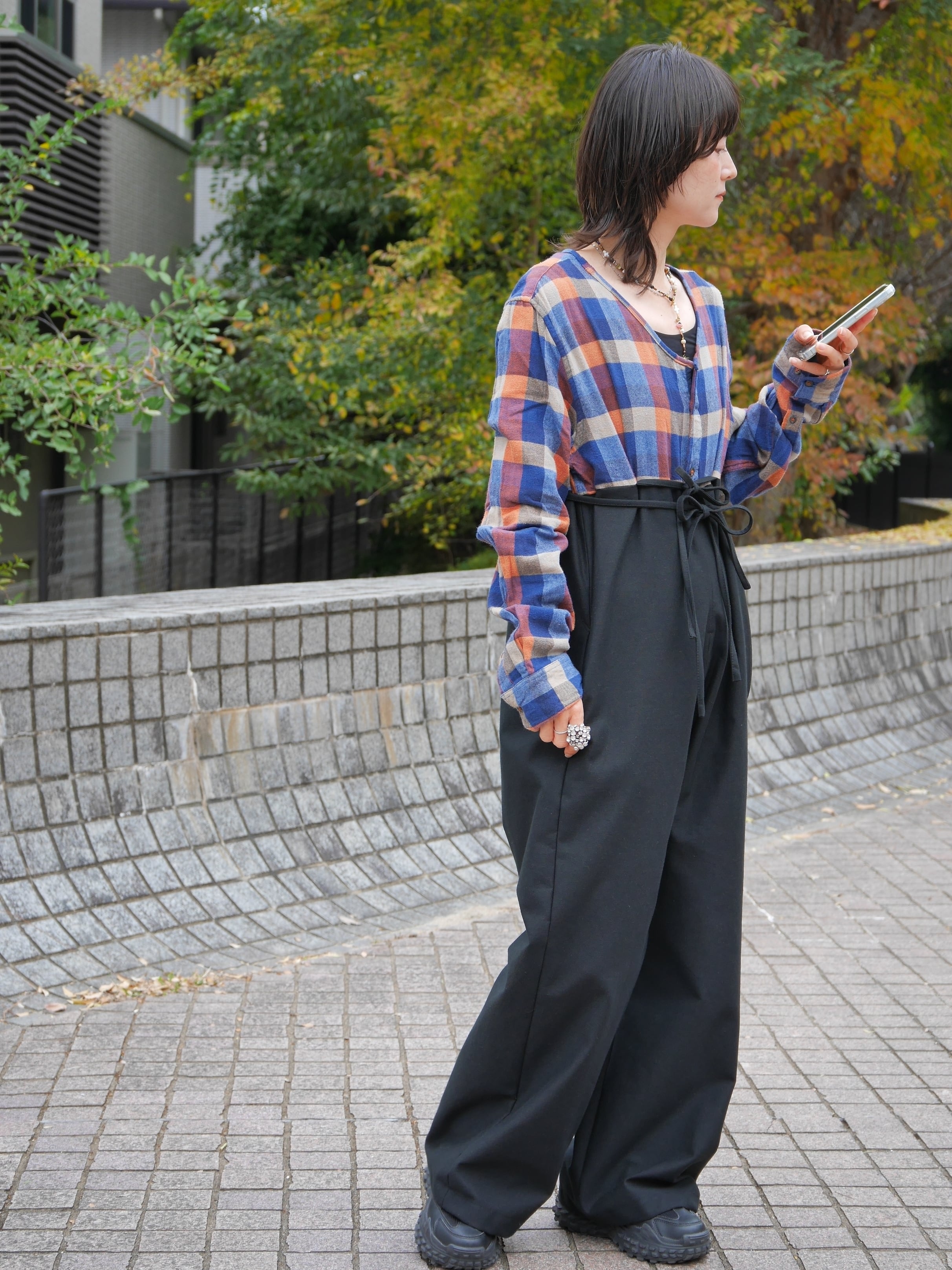トップスを下ろし、肩で結ぶとサロペットスタイルに